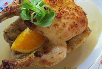 - Pollo limpio entero 1 y ½ kg.- Naranjas 2.- Cebolla en polvo 1 cda. sopera.- Aceite de oliva 8 cdas.- Jengibre fresco rallado 1 cda. sopera.- Pimienta negra molida.- Sal.