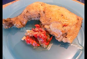 Un pollo de 2 kg, 2 cebollas, un pimiento rojo, 3 dientes de ajo, una hoja de laurel, perejil, tomillo, romero, albahaca, pimienta negra molida, una copa de brandy, aceite de oliva, 300 ml agua, sal.
