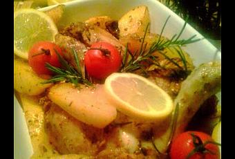 En una bandeja apta para el horno, colocamos el pollo troceado, condimentamos, añadimos el zumo de limón, el aceite, el caldo, y dejamos macerar por lo menos unas 4 horas,-mejor de un día a otro- en la nevera. De vez en cuando damos la vuelta a los trozos de carne y los mojamos bien en la mezcla.