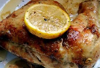 - En una fuente de barro, colocar el pollo, junto con la marinada, y asarlo aprox. 1 hora, dándole la vuelta de vez en cuando. Servir con rodajas de limón y espolvorear con tomillo y ralladura de limón.