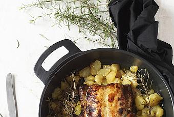 Poner el pollo asado en la cacerola. Meter en el horno durante 15 minutos a 190º, el horno a de estar precalentado con calor arriba y abajo. Mientras pelaremos las patatas y las chascaremos. Las freiremos en aceite de oliva hasta que se hagan bien. Una vez horneado el pollo poner alrededor suyo las patatas, las ramitas de tomillo y los dientes de ajo sueltos pero con piel. En un cuenco mezclar aceite de oliva y vinagre o zumo de limón y verterlo por encima del pollo y de las patatas. Meter en el horno y tenerlo otros 15 minutos a 190º.
