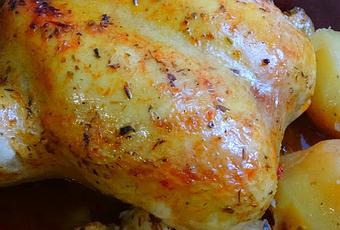 - Aparte, mezclar 1 cta. de tomillo, 2 ctas. de orégano, 1 cta. de pimentón, 2 ctas. de caldo de ave en polvo, 2 cuch. de miel, el zumo de 2 limones, ¼ vasito de brandy y ¼ vasito de vino blanco. Embadurnar bien el pollo con esta mezcla y dejarlo marinar durante 1 hora, dando la vuelta de vez en cuando, para que se empape todo bien.