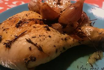 Encima de los dientes de ajo ponemos el pollo troceado con la piel hacia arriba y cubrimos con los 20 dientes de ajo restantes (que también golpearemos con el cuchillo). Echamos un chorrito de vino blanco, espolvoreamos con sal y pimienta negray algunas ramitas más de tomillo.