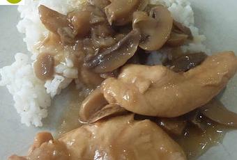 Lo primero que hacemos es rebozar el pollo con la sopa de cebolla y freimos con un chorrito de aceite de oliva. Cuando el pollo coja color, echamos el apletiser y la lata de champiñones. Tapamos y dejamos cocinar. En 10 minutos están listos, podemos dejar la salsa así o diluir maizena en agua fria y se la añadimos sin dejar de remover hasta que nos espese algo.Acompañar con arroz blanco o con papas fritas.