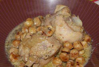 Dejamos reposar unos minutos y servimos el pollo regado con la salsa y unas cuantas avellanas. El resultado es estupendo.