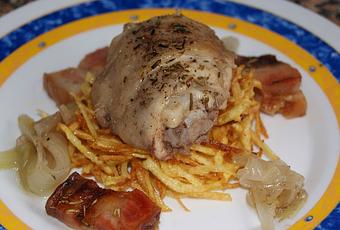 Dejamos reposar un poco. Servimos el pollo acompañado con unos trozos de bacon y cebolleta. Yo le he preparado una cama de patatas fritas estilo paja, que le quedan muy bien.