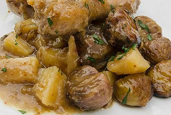 Para cuando ya tengamos la salsa preparada ya habrán pasado los primeros minutos de cocción del pollo. Lo sacamos de horno, le añadimos las castañas y bañamos con la salsa. Volvemos a introducir en el horno durante otros 20 minutos.