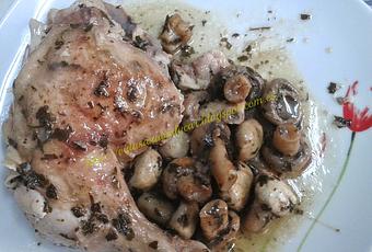 Muslos y contramuslos de pollo champiñones enteros frescos perejil seco ajo en polvo 1/2 vasito medidor de vinagre de manzana