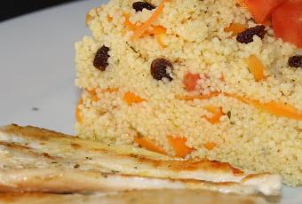 Echamos sobre el couscous el caldo de verduras, la cantidad siempre tiene que ser el doble de caldo que de sémola. Cortamos el tomate pelado en daditos y rallamos la zanahoria pelada. Se lo añadimos al couscous junto con las pasas y un poco de aceite y sal y el zumo de limón. Dejamos reposar unos 10 min.