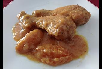 Ingredientes para 4 personas:1 de pollo en trozos2 cebollas4 dientes de ajo1 lata 800 g de melocotón en su jugo 2 cucharadas de salsa de soja2 vasos de caldo de polloPimienta molidaAceite de olivaSalElaboración:Pelar y picar las cebollas en trocitos. Los ajos con piel y machacados.Quitar el exceso de grasa del pollo y salpimentar.Poner en una cazuela plana aceite a calentar, añadir los ajos, cuando cojan color retirar. Dorar el pollo en el mismo aceite por todos los lados y que la carne quede tierna. Retirar y reservar.Añadir en el aceite sobrante, incorporar los gajos de melocotón y dorar ligeramente. Retirar y reservar. Guardar algunos gajos para adornar.Si se sigue teniendo un poco de aceite y si no añadir, poner la cebolla picada y pochar.Agregar la salsa de soja a la cebolla y salpimentar.