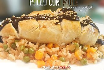 Colocamos una base o cama con el arroz rojo. Sobre ella disponemos la pechuga de pollo y regamos con el Mole. Espolvoreamos sésamo tostado por encima y listo. ¡Que aproveche, hitchcookian@s!