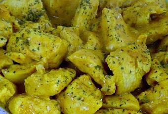 - Cortar en trozos de bocado 2 pechugas de pollo (unos 100 grs por persona) y embadurnar bien con la mezcla preparada.