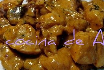 Esta riquísima receta es de Rocío (Un poquito de Rocío), una gaditana encantadora y que cocina de lujo, que hace un tiempo preparó mi quiche de queso. Buena muestra de su cocina es este plato que me envió para el concurso de Nuestras mejores recetas. Realmente es un plato estrella, Rocío! El próximo blog amigo es el de Marta (Hierbabuena y cilantro).- En una sartén rehogar con un poco de aceite, 1 cebolla grande cortada en juliana. Cuando empiece a dorarse, echar 1 kg. de pechugas de pollo cortada en cuadraditos, salpimentada.