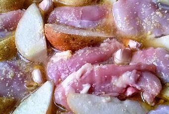 Pon el pollo en una bandeja de horno , sazonado ( ¡ cuidado que lleva la pastilla de caldo y le da un toque más salado ! ). Entre los trozos de pollo ve intercalando las peras cortadas en cuartos , lavadas pero sin quitarles la piel, sólo el corazón y los cabitos. De la misma pon los dientes de ajo sin pelar , haciéndoles un corte a la mitad. Pica el perejil y échalo por encima también.Espolvorea la pastilla de caldo por encima, el aceite, el agua y el vino.Introduce en el horno a 180º, unos 20 minutos. Pasa todo a una fuente menos el jugo sobrante que deja en reserva.Pon este jugo en una cazuela. Calienta a fuego lento y diluye un poco de harina de maíz en un poco de agua. Añade esto al jugo para espesar la salsa. Vierte la salsa encima del pollo y las peras. ¡ Saborea este delicioso plato !