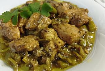 Poner en una cazuela plana aceite a calentar, dorar el pollo por todos los lados. Extraer y reservar.En mismo aceite, añadir la cebolla, el ajo y el pimiento, sazonar y pochar unos minutos.Agregar la cerveza, el azafrán disuelto en un poco de agua templada e incorporar el pollo frito. Cocer 20 minutos a fuego medio.