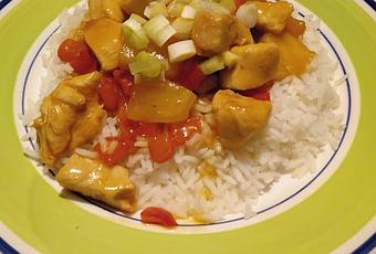 Ingredientes: 200 g arroz; 2 pechugas pollo; 1/2 piña natural; 1 pimiento rojo; 4 cebolletas (tipo ajetes); aceite; sal; pimienta.