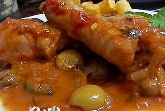 4. Versar el caldo, cubrir y continuar la cocción, a fuego moderado, durante 30-35 minutos, con la cazuela cubierta, mezclando de vez en cuando. 5. A 5 minutos del término de la cocción, añadir las aceitunas verdes y negras y dejarlas saborear. 6. Antes de servir el pollo, rociarlo con el perejil troceado y eliminar el laurel.