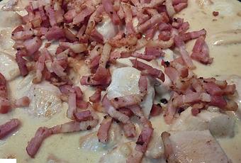 En la misma sartén doramos la cebolla y el ajo picaditos, incorporamos la nata y el queso, removemos hasta que se funda el queso, añadimos de nuevo el pollo, rectificamos de sal y de pimienta y dejamos cocinar 5-10 minutos. Disponemos por encima el beicon. Listo.