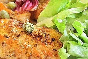 Y ya está!, ahora preparamos el plato, colocando el pollo tibio a un costado y la escarola al lado, esparcimos las alcaparras por encima.