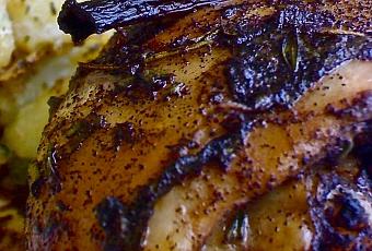 Picar los hierbas y limpiar la vaina de sus semillas poniendo todos los ingredientes en un molde apropiado. Cubrir el molde con papel de aluminio y ponerlo en el horno a 180° por 45 minutos. Entonces descubrirlo y dejarlo en el horno unos 40 minutos más, siempre mirando que el color sea el preferido y de vez en cuando con una cuchara recoger el líquido en el molde y recubrir las piernas de pollo con él.