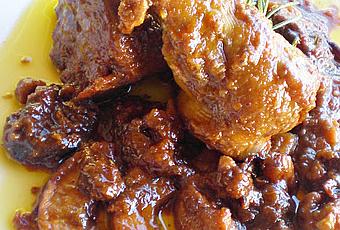 Añadimos el pollo reservado, un poco de tomillo, el Oporto, dejamos un minuto que evapore el alcohol y vertemos caldo de pollo, cuando hierva bajamos el fuego y semitapamos la cazuela, dejamos así unos 40 minutos. De vez en cuando removemos todo el conjunto.