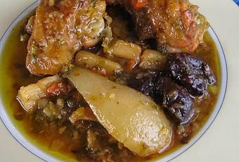 Troceamos el pollo y lo salpimentamos “Orientativo 3 trozos de cada cuarto de pollo y las alas a parte”Pelamos y cortamos los nabos a dados medianosPonemos el aceite de oliva a calentar en una cazuela, añadimos el laurel y la zanahoria, cuando la zanahoria empieza a coger color añadimos el ajo, removemos e inmediatamente añadimos el puerro, cuando empieza a romper el color añadimos la cebolla y dejamos sofreír a fuego medio hasta que todo esté bien pochado..Mientras se hace el sofrito, enharinamos el pollo y lo freímos en sartén aparte, hasta dejarlo doradito, lo ponemos sobre papel absorbente y reservamos.Cuando veamos que el sofrito está al punto añadimos los nabos, rehogamos unos minutos , añadimos las ciruelas pasas, removemos y añadimos el brandy flambeamos y dejamos reducir.Ponemos el pollo y el cava y llevamos a ebullición durante dos minutos, incorporamos el caldo y lo dejamos hervir a fuego lento hasta que el pollo esté tierno “orientativo según el pollo dos horas” Probamos y rectificamos de sal si fuera necesario (ten en cuenta que al añadir la pera, la salsa queda más dulce)