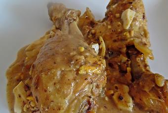 Salpimentamos el pollo y lo doramos en la cazuela con un poco de aceite de oliva, reservamos, a continuación doramos las almendras junto con los ajos, reservamos y ponemos en el mortero, calentamos un poco en papel de aluminio envuelto en papillote las hebras de azafrán procurando que no se quemen y a continuación se lo añadimos a las almendras y ajos, molemos con la mano del mortero, si nos gusta más fino también se puede hacer con la batidor Añadimos más aceite a la cazuela si fuese necesario y doramos la cebolla partida a trocitos pequeños,una vez dorada le incorporamos los muslos de pollo, el majado de almendras, ajos y azafrán, el vino blanco, la hoja de laurel, el agua o caldo de pollo, también sirve una pastilla de concentrado de pollo(si le echamos la pastilla controlar la sal que se le echa). Cocemos aparte dos huevos durante unos 10 minutos, echamos los huevos duros partidos a trocitos 5 minutos antes de terminar con el guiso.