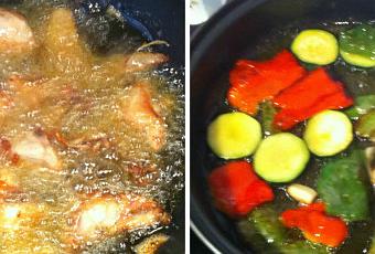En una sartén, con abundante aceite, ponemos a freír un poco el pollo. No hace falta freírlo mucho, ya que luego terminará de hacerse con la salsa.