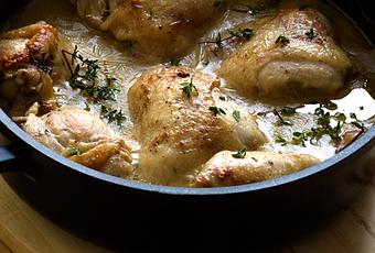 Hoy os traigo mi versión de esa receta, un pollo en salsa de ajo y tomillo. Cogí los ingredientes pero cambié la elaboración, ya que en el original utilizan la cocción en horno y yo lo he hecho en cazuela.