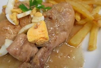 Se pelan las patatas, se lavan y se cortan en tiras. Se fríen en abundante aceite de oliva. Se escurren. Se le añade al pollo con la salsa o se sirven aparte.Se pelan los huevos duros y se cortan en trocitos pequeños.Se presenta el pollo en el plato con la salsa y las patatas juntas o como guarnición con el huevo y el perejil picado por encina. Se moja bien con salsa.