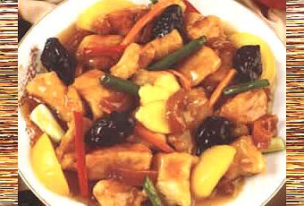 PreparaciónPasar los trozos de pollo por chuño, dorarlos en aceite, sazonador al gusto, añadir la salsa agridulce preparada con el almíbar de los duraznos. Dejar cocinar tres minutos, agregar los orejones, guindones, duraznos en trozos, pimiento, cebollitas chinas, ají, kión. Seguir cocinando por cinco minutos más. Servir.
