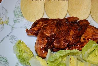 2 pechugas de pollo2 dientes de ajouna guindilla frescael zumo de 1/2 limón30 gr de miel1 cucharada sopera de salsa de soja1 cucharada de salsa barbacoa3 cucharadas de aceite de olivapimienta y salPreparación: