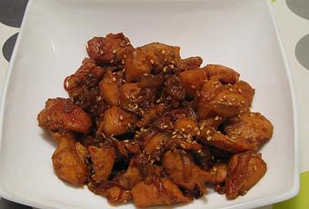 Ingredientes para 2 personas:- 2 pechugas de pollo- 150 ml de salsa de soja- 100 ml de vino blanco- 1 cebolla- Aceite de oliva- Sal- Semillas de sésamo