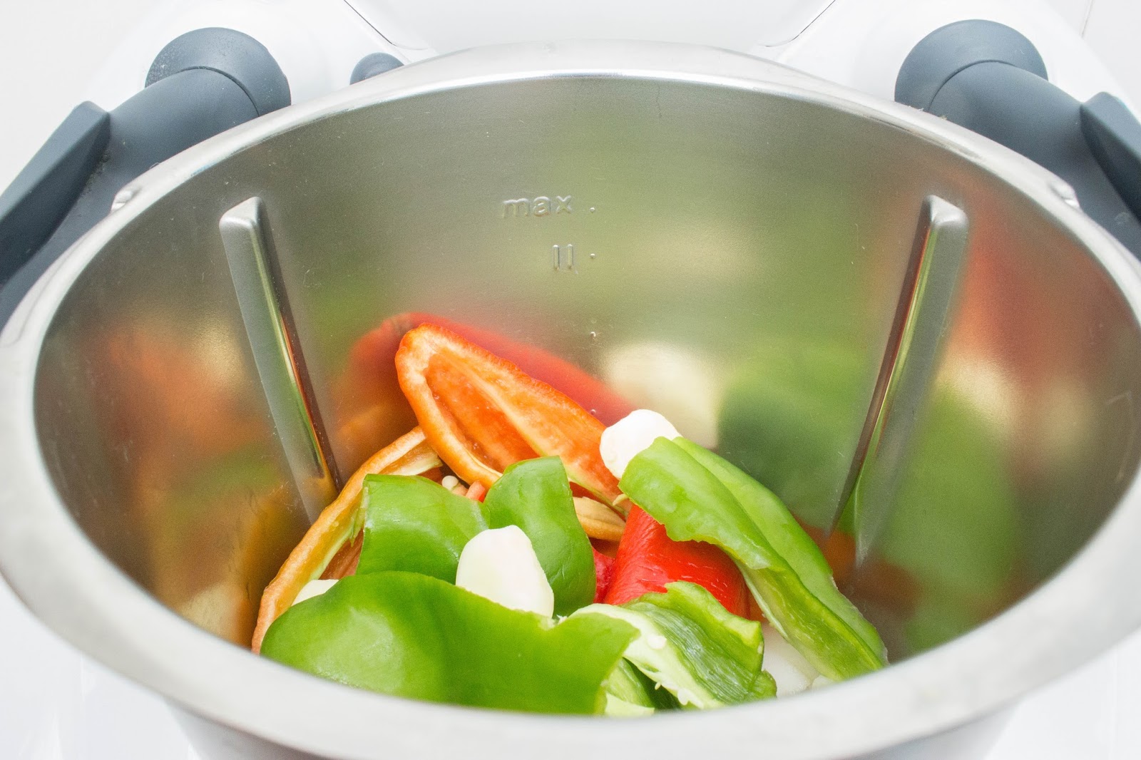 En el vaso de la Thermomix, echamos la cebolla, los dientes de ajo, el pimiento verde, el pimiento rojo, el tomate y la zanahoria.. Triturar durante 12 segundos, a velocidad 5. Usa la espátula para bajar los ingredientes que se quedan en las paredes.