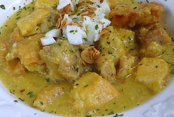 - En el mismo aceite, pochar 2 cebollas medianas y 1 diente de ajo, todo picado. Añadir 2 cuch de almendra molida y ½ vaso de vino blanco. Cuando se evapore el alcohol, añadir 1 hoja de laurel, unas hebras de azafrán y el pollo reservado. Cubrir con el caldo de pollo reservado y colado, y dejar cocer a fuego suave unos 40 minutos.