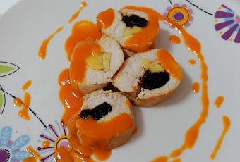 Corta el pollo por la mitad en forma de libro, Extiéndelas en la tabla y salpiméntalas y pon en en el centro la manzana cortada en láminas finas (rocíalas con el zumo del limón) y las ciruelas pasas cortadas. Enróllalas y átalas con hilo de cocina ( si no tienes usa el de coser pero une tres o cuatro cabos para que se haga un poco más gordito.