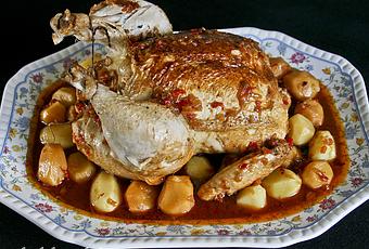 - Agregar un poco de agua sin que llegue a cubrir el pollo y las patatas, pues no se va a producir evaporación, por lo que no debe quedar excesivamente caldoso.