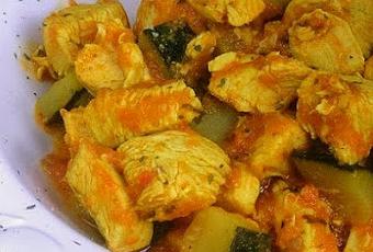- En una sartén con una cuch. de aceite de oliva, dorar los trozos de pollo escurridos del zumo, hasta que esté dorado. Añadir las especias y mezclar bien. Añadir 1 calabacín lavado y troceado, y seguir salteando. Añadir 3 tomates pelados y picados y un poco de cilantro fresco. Tapar la sartén y dejar hasta que el calabacín esté tierno y espese la salsa.