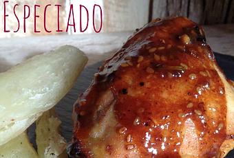 Lo cierto es que esa fórmula no funciona con esta receta, porque de haberlo hecho así habría dado como resultado un título kilométrico. Si bien la receta es secillísima lleva tal cantidad de especias que no habríamos acabado nunca. Así que se quedó en pollo especiado y punto.