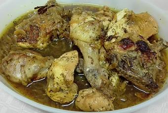 En la cubeta en menú plancha, fundir el aceite con la mantequilla, salpimentar el pollo, añadir el pollo a la olla, y sofreír removiendo bien, añadir la cebolla pelada y partida en juliana y sofreír unos minutos, añadir el agua y las especias, mezclar bien, cancelar menú, . Dejar media hora en la cubeta, para que la carne tome sabor.