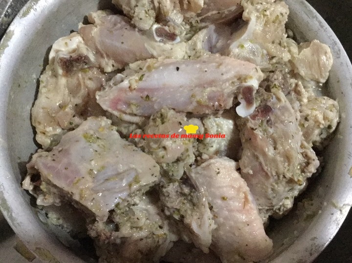 En primer lugar enjuagamos el pollo y lo ponemos en un bol reservamos.En el vaso de la batidora ponemos los dientes de ajo limpio junto con el resto de los ingredientes batimos bien y volcamos sobre el pollo mezclamos bien tapamos y dejamos macerar durante unas 4 o 5 horas( o mejor de un día para otro), colamos y secamos con papel de cocina.