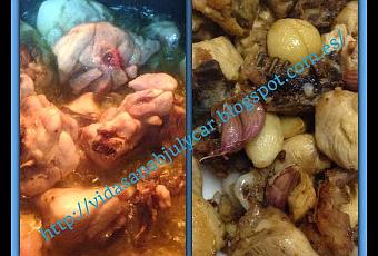Echamos el aceite y el pollo, pulsamos menú freir y vamos haciendo el pollo, antes de que se empiece a dorar echamos los ajos y añadimos la sal y vamos removiendo hasta que quede bien doradito, tarda sobre 15 minutos aprox. y listo para servir.