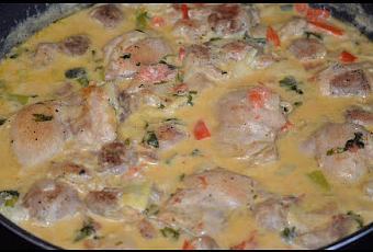 6. Reduce el fuego a medio-bajo, tapa la olla y deja que el pollo se guise durante aproximadamente 45 minutos o hasta que esté tierno y la salsa se haya espesado ligeramente.