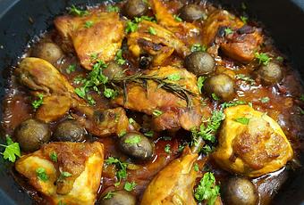 La diferencia está en la forma de cocción, primero en la hornalla, y luego en el horno, por lo que el pollo no se deshace, y queda dorado y apetitoso. Yo le puse portobelos, pero puedes colocar unas patatas, previamente hervidas a medio punto, y que se termine de cocinar en el horno