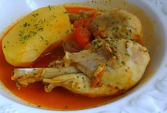 Receta de Mari Orellana. Si pincháis en el enlace, podéis ver el video de la receta de Mari.- Poner en la cubeta de la olla 6 muslos de pollo (o 4 cuartos traseros cortados a la mitad), 4 patatas medianas peladas, 1 cebolla en juliana, 2 tomates cortados a cuartos, 4 dientes de ajo laminados, hierbas provenzales, 1 cta. de pimentón dulce, sal, pimienta, el zumo de ½ limón, 2 hojas de laurel, un chorro de vino blanco y una pastilla de caldo de carne o pollo desmenuzada. Mezclar todo bien. (No añadir nada de agua).