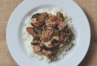 Servir con arroz blanco y poner sésamo o algún otro fruto seco por encima.
