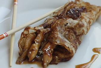 Servir el pollo dentro del crep y con una salsa de dos partes de miel por una de soja que reduciremos un poco en una sartén para que esté más densa.