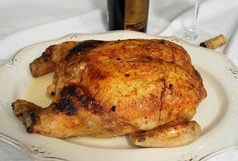 Cortar el pollo con un cuchillo afilado, os aconsejo dejarlo reposar un poquito antes de cortarlo. De este modo os será mas fácil y no se romperá. Servir con un poco de salsa y decorar con un poquito de tomillo fresco, si lo tenéis.