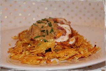 Para acompañar hacemos junto al mismo pollo una salsa de oporto y cebolla que te mueres muerta.. y sobre una capa de patatas paja, que lo mismo pueden ser unas patatas panadera, un gratín o un ratatouille y no me diréis que no queda un plato lucidísimo... Y ya os repito, sencillo, rápido de preparar, cunde un montón y sale bastante bien de precio.