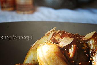 Estareceta, se cocina en olla, incluso dependiendo de la dureza del pollo en ollaexpress. Nosotros la hacemos en tajine y dentro del horno, los resultadosfinales son muy parecidos, se trata simplemente de algo relacionado con lapracticidad. Os explicamos cómo lo hacemos. Esta, es una receta tradicional.IngredientesUno odos pollos pequeños (picantones)Cebollay ajoJengibrefrescoSal,pimienta, comino y cúrcumaAlmendras,ciruelas pasas, semillas de sésamo y dátiles